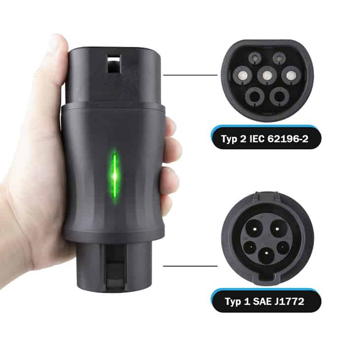 מתאם Type 2 ל Type 1. מתאם כבל טעינה לרכב חשמלי אמין ועמיד במיוחד. מתאים לזרם של עד 32A ו- 22kw. מגיע עם שנה אחריות.
